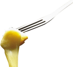 “奶酪火鍋”是瑞士最普遍、最具盛名的火鍋之一。瑞士人制作“奶酪火鍋”一般都是先以蒜涂抹于鍋底,再將不同口味的硬奶酪擦成碎末放入鍋中加熱成糊狀,再加淀粉、白葡萄酒、大蒜、奶油等,繼續(xù)煮并慢慢攪拌至完全融化呈濃濃的煉乳狀,最后放進(jìn)一些黑胡椒即可。上桌后,人們用長柄叉子叉著切成四五厘米見方的“法式長棍面包”蘸著奶酪吃,很像中國的“拔絲香蕉”。此外,吃這種火鍋時,瑞士人還特別喜歡配上有助于清口的風(fēng)干牛肉、腌酸黃瓜、小洋蔥。不過,吃這種火鍋一定要“點到為止”,雖然奶酪富于營養(yǎng),但很難消化,用白葡萄酒融化奶酪,就是為了幫助消化。