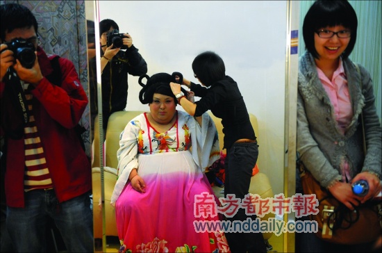 光梳妝打扮,林思思花了一個多小時。盤上發(fā)髻,插上金簪,披起拖地長裙,秋波流轉(zhuǎn),“我漂亮嗎?”沒人敢否認,歷練多年后,這個28歲的重慶小伙反串楊貴妃頗有一手。他卻要折騰,昨日,他來到深圳和鵬程醫(yī)院一同面對媒體,宣布將接受整形,今后以“沈殿霞”形象示人。