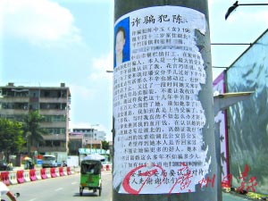 中山雅商律師事務(wù)所的律師封謨喜對(duì)記者表示,“公開把別人的身份資料貼在公共場(chǎng)合,這是違法的行為。輕則違反《治安管理處罰條例》,重則構(gòu)成了犯罪。如果貼了幾十張,這種行為其實(shí)算是比較嚴(yán)重了!贝送,封律師對(duì)記者表示,未經(jīng)審判,直接稱他人為“詐騙犯”,這也是侵害名譽(yù)權(quán)的行為。封律師表示,若認(rèn)定被詐騙可向公安部門報(bào)案(記者張堅(jiān)攝影報(bào)道)