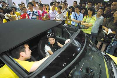 昨日下午3:30左右,寶馬展廳里那輛惹眼的黃色i Cooper前早已人頭攢動(dòng),上百市民駐足此地觀看名車(chē)。