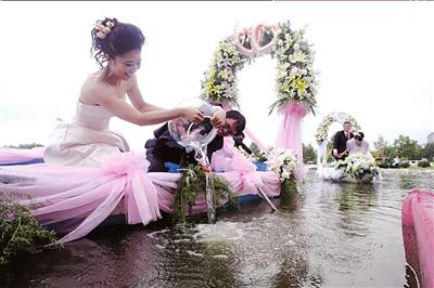 昨天,新人們攜手將象征和平、幸福、美好、富有的金魚(yú)倒入池中。當(dāng)天早上7點(diǎn)多鐘,北京太陽(yáng)宮公園內(nèi)的水上游園里多了3艘被各式鮮花裝扮得十分漂亮的花船,有三對(duì)新人將在這里舉辦京城首場(chǎng)浪漫的“水上集體婚禮”。上午8時(shí),集體婚禮準(zhǔn)時(shí)開(kāi)始,在婚禮進(jìn)行曲及主持人的祝福聲中,新人們踏上“花船”,新娘坐船頭,新郎搖槳,水中“漫游”,新人們船中相互許愿,并攜手將象征和平、幸福、美好、富有的金魚(yú)倒入池中……