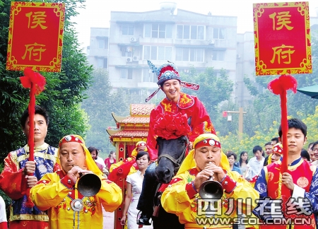 高頭大馬、花轎鳳冠、迎親嗩吶……一場熱鬧喜慶的中式婚禮吸引了眾人的眼光。昨日上午,在成都沙河公園,成都小伙侯俊用這樣的方式迎娶重慶新娘稅嘉;閼c公司策劃人曾真說,隨著中秋即將來到,國慶大假期間不少新人放棄了婚紗香檳下的西式婚禮,采用傳統(tǒng)中式習(xí)俗。