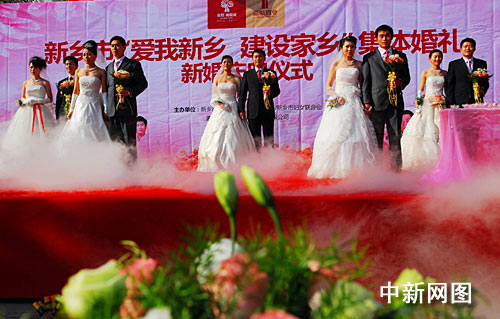 中新網(wǎng)新鄉(xiāng)11月22日 (記者 史寶銀 向明超)11月22日上午,由新鄉(xiāng)市文明辦、共青團(tuán)新鄉(xiāng)市委、新鄉(xiāng)市婦女聯(lián)合共同主辦的“愛(ài)我新鄉(xiāng)、建設(shè)家鄉(xiāng)”集體婚禮在新鄉(xiāng)市人民公園東門(mén)廣場(chǎng)隆重舉行。慶典儀式上,新郎新娘紛紛捐出了自己的禮金,購(gòu)買(mǎi)了5000枚石榴花圖案的新鄉(xiāng)市徽向市民免費(fèi)發(fā)放,同時(shí)倡議市民熱愛(ài)家鄉(xiāng),建設(shè)家鄉(xiāng)。