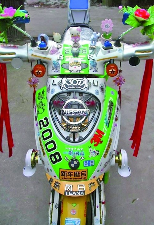這輛電瓶車不得了,看車頭:寶馬、標致、日產(chǎn)、東風各種標致全貼上了,還有可愛的helllo kitty 、snoopy等小掛飾,更加“致命”的是兩個反光鏡上還綁著兩朵大紅塑料花,就一輛電瓶車而言,可謂“風騷”到了極點。