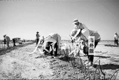 此次活動(dòng)的主要任務(wù)是植沙障。原來(lái),當(dāng)?shù)胤乐紊郴饕欠N植了一種叫做堿蓬的植物,為了防止大風(fēng)吹走堿蓬的種子,就將折斷的枯樹(shù)枝一排排整齊地插在土里,也就是沙障了。
