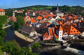 克魯姆洛夫距離首都布拉格160公里,1992年被聯(lián)合國教科文組織列為世界文化遺產(chǎn)。從布拉格搭乘巴士,三個小時(shí)就到了。下了車,看著眼前的柏油公路和飛馳而過的汽車,茫然不知如何把眼前的城市景觀和傳說中的童話小鎮(zhèn)聯(lián)系上。跟隨著同車的兩三個背包客,跨過一座橋到了公路對面,瞬時(shí)眼前出現(xiàn)了一座暗紅色的磚砌拱門,右前方水聲潺潺,郁郁蔥蔥的樹木后可見一座頗具童話特征的彩繪圓形塔。這一切告訴我,這扇拱門就是通往童話小鎮(zhèn)的入口了。