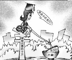 漫畫一:28日,《大眾日?qǐng)?bào)》發(fā)表評(píng)論“海歸降薪求職敲響盲目留學(xué)警鐘”,所配漫畫海歸女孩站于博士帽和40萬元鈔票上,垂釣期望的1500元月薪。