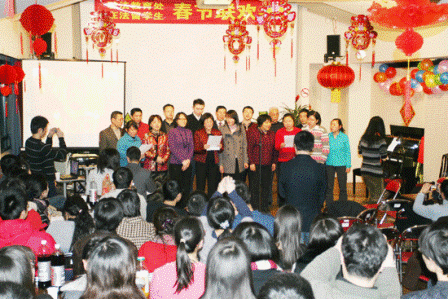 年夜飯后,教育處的老師與留學(xué)生們又組織了一臺自己的“春晚”。朱公參首先向虎年生人的老師和學(xué)生贈送了紀(jì)念品,由旅法畫家李中耀設(shè)計的法國虎年郵票5連張。朱公參和老師們一起向大家演唱了《我和我的祖國》。作為音樂愛好者的戴天華老師在大家的熱烈要求下,還獻(xiàn)上了獨唱歌曲。學(xué)生們也是各顯其能。晚會上還進(jìn)行了豐富的抽獎活動;⒛昃驮谌藗兊母杪、笑聲、歡樂聲中悄然而至了。(黃冠杰)