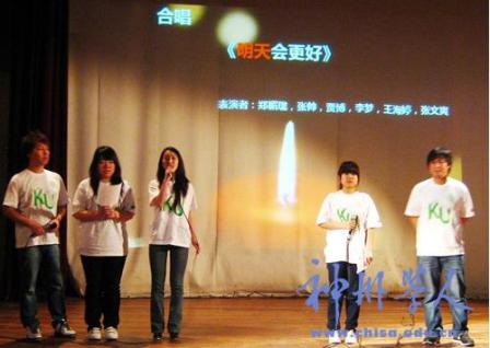 在中國駐韓大使館教育處的領(lǐng)導(dǎo)和在韓中國留學(xué)生聯(lián)合會的號召下,由建國大學(xué)學(xué)生會籌劃舉辦的“情系玉樹”,即建國大學(xué)留學(xué)生為玉樹災(zāi)區(qū)人民祈福募捐晚會,于4月28號在建國大學(xué)學(xué)生會館小禮堂莊嚴(yán)舉行。