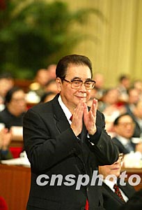 十屆全國人大一次會議十八日在北京人民大會堂閉幕,參加會議的前委員長李鵬起立向代表們致意。作者:毛建軍