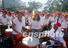 中新網(wǎng)7月14日電 香港昨日擊鼓創(chuàng)造三項(xiàng)世界紀(jì)錄,二千多名鼓手同時(shí)敲擊中國(guó)鼓﹑世界最大的中國(guó)鼓和銅鑼。香港中樂(lè)團(tuán)主辦的“香港鼓樂(lè)節(jié)”昨天下午在維多利亞足球場(chǎng)舉行“澎湃活力,香港同心”開(kāi)幕式,打破三項(xiàng)世界紀(jì)錄。