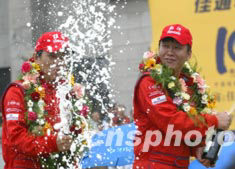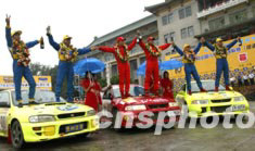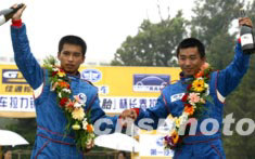 2003年中國(guó)汽車?yán)愰L(zhǎng)春站比賽17日全部結(jié)束,來(lái)自云南紅河車隊(duì)的劉斌(右)、領(lǐng)行員黃煜獲得N組比賽冠軍。中新社記者:趙振清