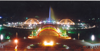 在主入口廣場上的五彩世紀門,宛若彩虹飛至,象征新世紀的曙光。市民廣場以硬質(zhì)景觀為主,便于人們集會、休憩、交往,是真正意義上的城市客廳,在市民廣場上建有大型水旱組合型彩色音樂噴泉,共有28種水形變化。其東西長200米,面積4500余平米,并配有水幕投影系統(tǒng),中央旱噴泉主噴高達80米。東西兩側水泉對稱布置,為觀賞噴泉。兩側旱泉為游戲噴泉,以滿足人們的親水愿望,東側有奧運五環(huán)、時空隧道、歡快跳泉,西側有戲水踏泉、游戲迷宮,兩側可同時供200多人參與游戲。音樂噴泉綜合運用現(xiàn)代高科技手段,聲、光、水、電的完美結合,使噴泉水形豐富、氣勢宏偉、搖曳多姿,隨著音樂翩翩起舞,夜晚在彩色燈光的照耀下,更顯得魂麗多彩,聲、光、水景把您帶入一個優(yōu)美的藝術境界。它充分表現(xiàn)了保定一千一百萬人民團結奮進、蓬勃向上、經(jīng)濟和社會發(fā)展日新月異、繁榮昌盛的壯麗景象。在市民廣場的下面建有地下商城,占地面積3萬平米,為游人購物、餐飲、娛樂、提供了寬敞、便利的空間。