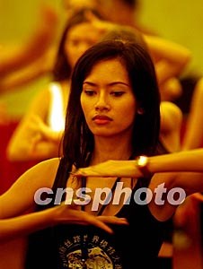參加新絲路世界模特大賽的泰國小姐,十月二十七日在杭州跟隨中國教師一板一眼學習戲曲動作藍花手。中新社記者:賈國榮