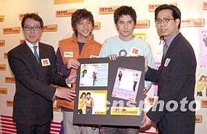 樂壇組合Shine成員黃又南、徐天佑12月2日在香港出席《Kodak數(shù)碼沖曬多面睇》記者會,Kodak更設(shè)計(jì)了一套三款的「Kodak ×Shine 2004慈善相片年歷」予香港世界宣明會作慈善用途。中新社記者:鄧慶樂