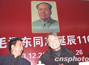 在毛澤東誕辰一百一十周年之際,韶山迎來(lái)毛澤東弟弟毛澤民之子——毛遠(yuǎn)新。毛遠(yuǎn)新是哈爾濱軍事工程學(xué)院的高才生,一九七五年在毛澤東病重期間出任其聯(lián)絡(luò)員,負(fù)責(zé)向中共中央政治局傳達(dá)毛澤東的指示。一九七六年入獄,一九九三年刑滿出獄后到上海汽車工業(yè)質(zhì)量檢測(cè)研究所工作,二零零一年退休。圖為毛遠(yuǎn)新(右)出席韶山市紀(jì)念毛澤東誕辰一百一十周年座談會(huì)。作者:殷敏鴻