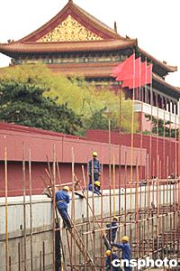 中新網(wǎng)3月25日電 3月24日,北京天安門觀禮臺翻建工程開工,預(yù)計在今年十月一日國慶節(jié)前竣工。昨天上午,《北京晚報》記者走訪了觀禮臺的設(shè)計者,今年已92歲高齡的張開濟(jì)老人。