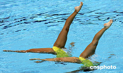 圖為在當(dāng)?shù)貢r(shí)間8月24日舉行的女子花樣游泳雙人賽中,美國(guó)選手Alison Bartosik和Anna Kozlova的精彩表演。