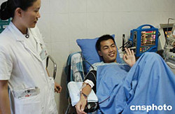 年僅十九歲、現(xiàn)就讀于廈門南洋學(xué)院的在校大學(xué)生張良建(右一),九月九日在福建醫(yī)科大學(xué)附屬協(xié)和醫(yī)院輸血科干細胞采集室內(nèi)接受造血干細胞采集,引起有關(guān)專家的重視。這是迄今為止福建省首例在校大學(xué)捐獻造血干細胞。據(jù)了解,福建省現(xiàn)有十三萬名患者等待造血干細胞移植,每年新增白血病患者約一千二百人。作者:劉可耕
