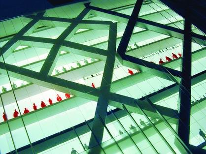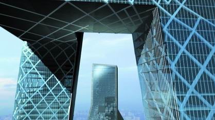 CCTV主樓的兩個(gè)塔樓從一個(gè)共同的平臺(tái)升起,在上部匯合,形成三維體驗(yàn),突破了摩天樓常規(guī)的豎向特征的表現(xiàn)。復(fù)雜的功能包容在內(nèi)部緊密連接的環(huán)路中,體現(xiàn)一個(gè)相互合作、相互依存的鏈條以及自身組織的有序和協(xié)調(diào)。