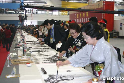 中新網(wǎng)11月6日電(記者邱觀史)為期三天的“中日書法繪畫交流大展”6日在美麗的太湖之濱江蘇無(wú)錫拉開帷幕。百名中日書畫家展示他們傾心裝做的200余幅作品,為觀眾獻(xiàn)上極富美感的視覺享受。中國(guó)文化部副部長(zhǎng)?巳食鱿_幕式并發(fā)表講話。