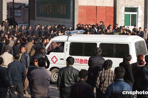 十一月二十九日下午,救護(hù)車在發(fā)生瓦斯爆炸事故的陜西銅川礦務(wù)局陳家山煤礦外待命,隨時準(zhǔn)備救治至今下落不明的礦工。作者:任晨鳴