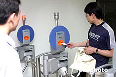 5月25日,2004年北京國際汽車展新聞發(fā)布會(huì)在北京舉行,中國國際展覽中心集團(tuán)公司(中展集團(tuán))在會(huì)上宣布,今年的車展將全面啟用電子票證系統(tǒng),以解決歷屆汽車展買票難、賣票現(xiàn)場混亂以及假票等問題。圖為參加新聞發(fā)布會(huì)的記者提前體驗(yàn)電子票證系統(tǒng)的快捷、方便。中新社記者:盛佳鵬