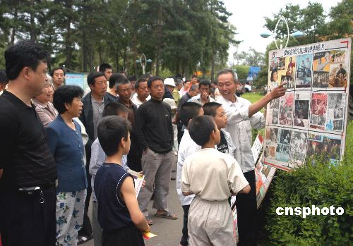7月4日,牡丹江市空調(diào)機廠退休職工李易智把精心準(zhǔn)備的抗戰(zhàn)勝利60周年畫板向市民展出,這是他連續(xù)6年的第600多場展出。作者:張克非