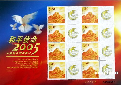 中俄聯(lián)合軍事演習(xí)導(dǎo)演部和中國集郵總公司19日聯(lián)合發(fā)行“和平使命—2005”中俄聯(lián)合軍事演習(xí)紀(jì)念封1枚和專題紀(jì)念封4枚,以紀(jì)念“和平使命—2005”中俄聯(lián)合軍事演習(xí)。這5枚紀(jì)念封以精裝卡書和簡裝卡書兩種方式裝幀。圖為精裝卡書中的一版8枚個(gè)性化郵票。作者:王麗南