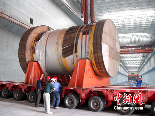 9日,由東方電機(jī)廠、哈海濱電機(jī)廠、天津阿爾斯通水電設(shè)備有限公司分別承建的3臺每臺重達(dá)百噸的三峽地下電站水輪發(fā)電機(jī)主軸,由有96個(gè)車輪的特種車輛運(yùn)載,在三峽壩區(qū)交警全程護(hù)運(yùn)下,從江北重件倉庫出發(fā),橫跨西陵長江大橋,陸運(yùn)12公里順利抵達(dá)三峽右岸電站廠房先期調(diào)試,確保穩(wěn)定正常工作后,預(yù)計(jì)下月再轉(zhuǎn)移安裝到地下電站。