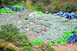 近日,有熱心讀者致電廣州日報稱一個地下金屬回收廠藏身于布吉南灣一處山坳里,留意觀察才發(fā)現(xiàn)里面的人用明火和強(qiáng)酸提煉各種金屬,近百桶裝滿各種腐蝕性、強(qiáng)酸性的化學(xué)品就堆放在一個雨棚下面,對周邊環(huán)境危害很大。1月25日上午,記者驅(qū)車從吉廈工業(yè)園內(nèi)經(jīng)過一段崎嶇不平的山路,才在一處山坳里找到這處極其隱蔽的地下金屬回收廠。