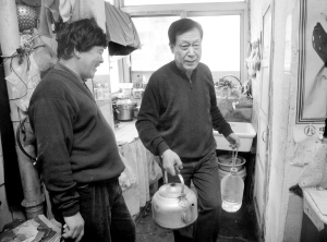 記者看到,居民常先生左手拎著塑料桶、右手提著鐵皮壺,緩慢地沿外樓梯上樓!绊敇嵌紱]水三個月了,我們過了個干巴巴的年!彼f,“自來水公司承諾年前來水,可沒兌現(xiàn),到現(xiàn)在還是這樣。”