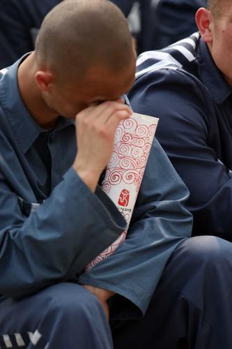 2008年5月6日,北京某監(jiān)獄,由服刑人員自制的祥云火炬在各監(jiān)區(qū)傳遞!皣鴥(nèi)火炬?zhèn)鬟f儀式”上,當(dāng)圣火經(jīng)過地圖上的家鄉(xiāng)時,親切的旋律及關(guān)于家鄉(xiāng)風(fēng)土人情的介紹旋即傳到在場每位服刑人員耳畔,不少人流下思鄉(xiāng)悔過的淚水。