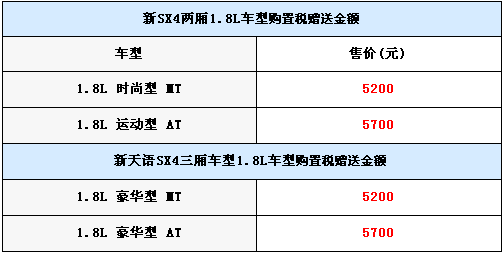 2009年3月10日,長安鈴木新款SX4車型上市。此次上市的新車共有1.6L和1.8L兩個(gè)排量,其中1.8L為新增車型。新款SX4兩廂/三廂車型各推出5款車型,共計(jì)10款,售價(jià)區(qū)間為9.88~13.38萬元。同時(shí),長安鈴木宣布,購買新增天語SX4 1.8L車型將獲贈(zèng)50%的購置稅補(bǔ)貼,享受與 1.6L車型同等的購置稅優(yōu)惠,讓購車者得到更多的實(shí)惠。具體車型售價(jià)如下: