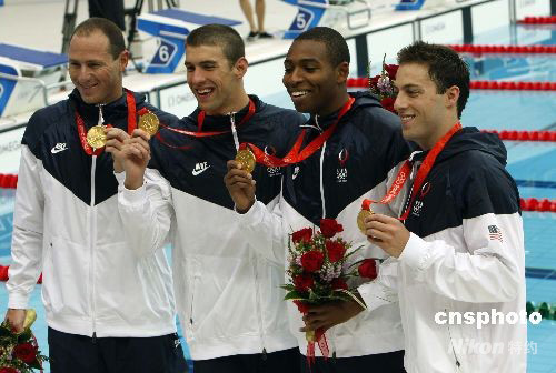 8月11日,美國隊(duì)奪得北京奧運(yùn)會男子4x100米自由泳接力金牌,并打破該項(xiàng)目世界紀(jì)錄! ≈行律绨l(fā) 杜洋 攝