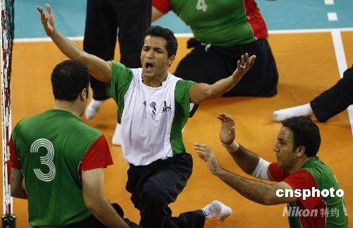9月15日,北京殘奧會男子坐式排球決賽,伊朗隊(綠)以3比0的比分戰(zhàn)勝波黑隊,獲得冠軍。中新社發(fā) 杜洋 攝