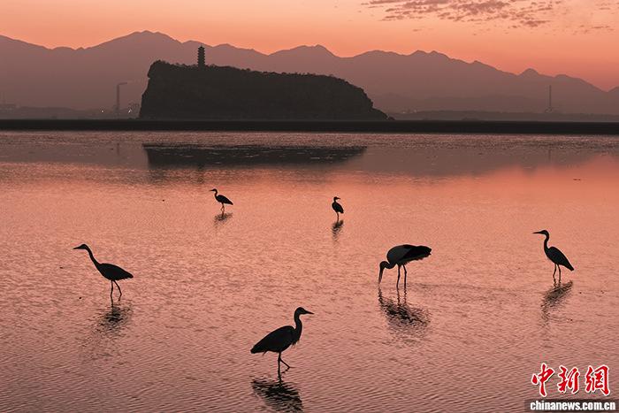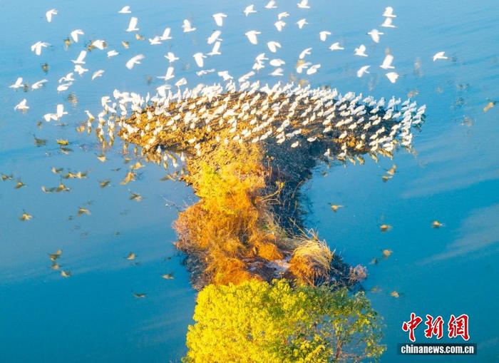 江蘇興化:候鳥(niǎo)飛抵濕地公園 淺灘覓食休...