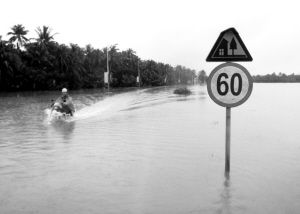 瓊海嘉積鎮(zhèn)多條道路遭受內(nèi)澇。17日下午2時(shí)許,南國(guó)都市報(bào)記者徒步趟過(guò)3公里積水路段,來(lái)到上次受災(zāi)嚴(yán)重的嘉積鎮(zhèn)橋頭村委會(huì)。該村委會(huì)通往嘉積的兩條道路豪華路、嘉博路部分路段積水超過(guò)1米。如果不是路邊豎立的路燈,很難分清哪里是道路,哪里是路邊水田。