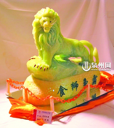 據(jù)了解,朱愛明已經(jīng)完成了石花膏雕琢的石獅市標(biāo)“東方醒獅”,泡沫雕成的“鯉魚化龍”。目前,他正在用南瓜和白蘿卜一起合雕泉州市標(biāo)“飛天迎賓”,并計(jì)劃在今年年底之前將晉江、惠安、永春、德化等地的城市標(biāo)志都雕刻出來。(莊金泉 林錦旺 文/圖)
