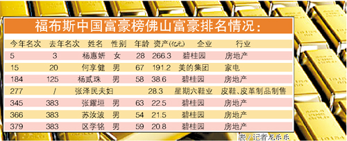 對(duì)比20天前剛剛發(fā)布的胡潤(rùn)富豪榜,在佛山富豪方面,新的福布斯排行榜表現(xiàn)出了上榜人數(shù)少、富豪身家縮水的特點(diǎn)。例如楊惠妍在胡潤(rùn)榜上顯示的財(cái)富是330億元,而福布斯顯示為266.3億元,而何享健的身家也縮水4億元。此外,格蘭仕梁德慶、金盛盧氏等在胡潤(rùn)榜單中有優(yōu)秀表現(xiàn)的本地富豪在福布斯中卻不見(jiàn)蹤影。