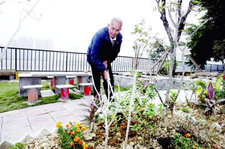 在福建省福州市洪山橋頭的閩江邊上,有個約100平方米的微型“公園”,中央是棵剛移種來不久的榕樹,周邊散布著好幾個精心修葺的花壇,里面種著剛移栽不久的花草,“公園”還錯落擺放著十幾張石桌椅,地面坑洼處被細心地用水泥和磚塊填平。這個附近社區(qū)的居民們早晚散步休息的“公園”,剛建好一個月,出資、拉“贊助”、設(shè)計、施工全由一個年近八旬的老人完成。