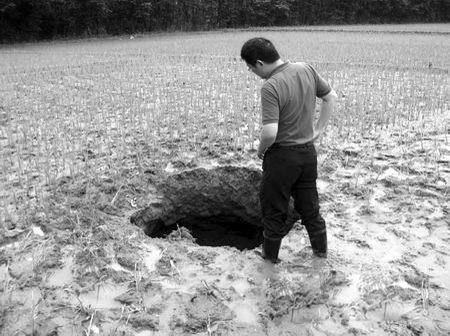 懷遠(yuǎn)鎮(zhèn)政府工作人員尹波也證實(shí)說(shuō),因?yàn)椴逖碜訒r(shí)向田里灌水,泥土經(jīng)過(guò)浸泡后引起了地面的塌陷。