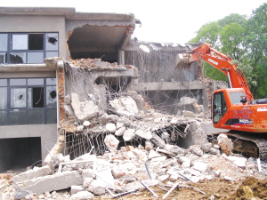 記者上午在現(xiàn)場看到,為了防止意外發(fā)生,不少執(zhí)法隊員都在現(xiàn)場待命,3輛大型挖掘機伸出鐵爪,猛地將屋面和墻壁敲碎,隨著轟隆隆的倒塌聲,兩幢豪華別墅逐步被肢解,現(xiàn)場塵土飛揚,鋼筋裸露。一些圍觀的居民感慨地說:“不簡單哪,要不是媒體介入,誰能拆掉這么牛的違建!”到了下午3點多鐘,記者發(fā)現(xiàn)兩幢豪華別墅已經(jīng)從堤壩上消失,現(xiàn)場一片狼藉。