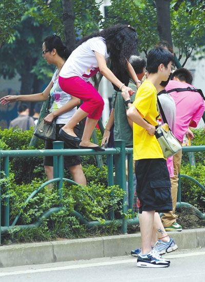 就為了走近路,穿著短裙的美女也顧不上走光的尷尬,從護(hù)欄上一跨而過(guò)。