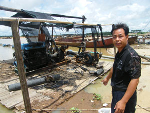 昨天上午11時(shí)許,記者與梁先生一同到現(xiàn)場了解情況。梁先生的金江沙場位于定安定城鎮(zhèn)和?谛缕骆(zhèn)交界處,已經(jīng)暫停作業(yè),工人們?cè)诠づ镄菹。記者在采沙船被毀現(xiàn)場看到,采沙船擱淺在岸邊,采沙機(jī)器完全被毀,電池?zé),木板千瘡百孔,表面被大火熏得烏黑,?nèi)部零件完全破壞。雖然距離案發(fā)已有10余天,當(dāng)時(shí)大火熊熊燃燒的情景依然可以想見。