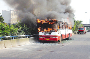 早8點(diǎn)35分,北京市東南三環(huán)華威橋南側(cè)一輛638路公交車發(fā)生自燃,司機(jī)在發(fā)現(xiàn)危險情況后立即將公交車?枯o路安全地帶,疏散車內(nèi)乘客,并報警,8時50分,公交車大火被消防員迅速撲滅。