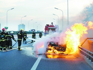消防員趕到時,火勢正處于猛烈燃燒階段,就在大家準備撲救之時,捷達車的前輪發(fā)生爆炸,鋼圈被震至橋下的河中,緊接著,油箱又發(fā)生了爆炸,將車門玻璃震碎,泄漏的油著火將整輛車包圍。