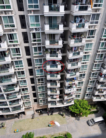 住在小區(qū)2號(hào)樓的老王目擊了整個(gè)過程。“他當(dāng)時(shí)半蹲著,雙手緊抓著陽臺(tái)護(hù)欄,雙腳踩在陽臺(tái)外側(cè)的邊沿上!崩贤跻贿吥7履凶赢(dāng)時(shí)的姿勢(shì),一邊說,“他嘴里一直在喊救命,小區(qū)門口的保安聽到后趕緊往那邊跑,我也趕過去想幫助救人。保安剛到樓下,那小伙子的左腳突然滑下來,他往上蹬了幾下,沒蹬上去,右腳也跟著滑了下來,僅靠雙手抓住護(hù)欄。沒幾秒鐘,人就摔了下來!