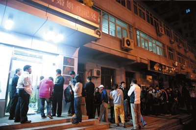 據(jù)了解,絕大部分婚登機關(guān)在早6點開門辦公,少數(shù)幾個區(qū)如朝陽婚登處因為有新人早早就來排隊,在零點就開門為新人辦理登記手續(xù)。