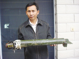 昨天一大早,記者來(lái)到朱賢文家,那是一幢很漂亮氣派的別墅式的小三樓建筑,樓下還開(kāi)有一家小店。小朱正在院子里盤(pán)弄著一個(gè)類(lèi)似火箭彈一樣的綠色物體,在他腳下的一只破臉盆里,凌亂的放著些黑色部件。小朱說(shuō),這些零部件都是彈體上掉下來(lái)的,他也不知道是些什么玩意。附近多名村民也圍聚在小朱家中,一邊看稀奇一邊熱議這到底是個(gè)什么東西,同時(shí)探討小朱該到何處去尋求賠償。